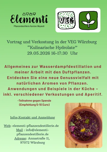 Vortrag und Verkostung in der VEG Würzburg "Kulinarische Hydrolate". Allgemeines zur Wasserdampfdestillation und der Arbeit mit Duftpflanzen. Anwendungen und Beispiele […]